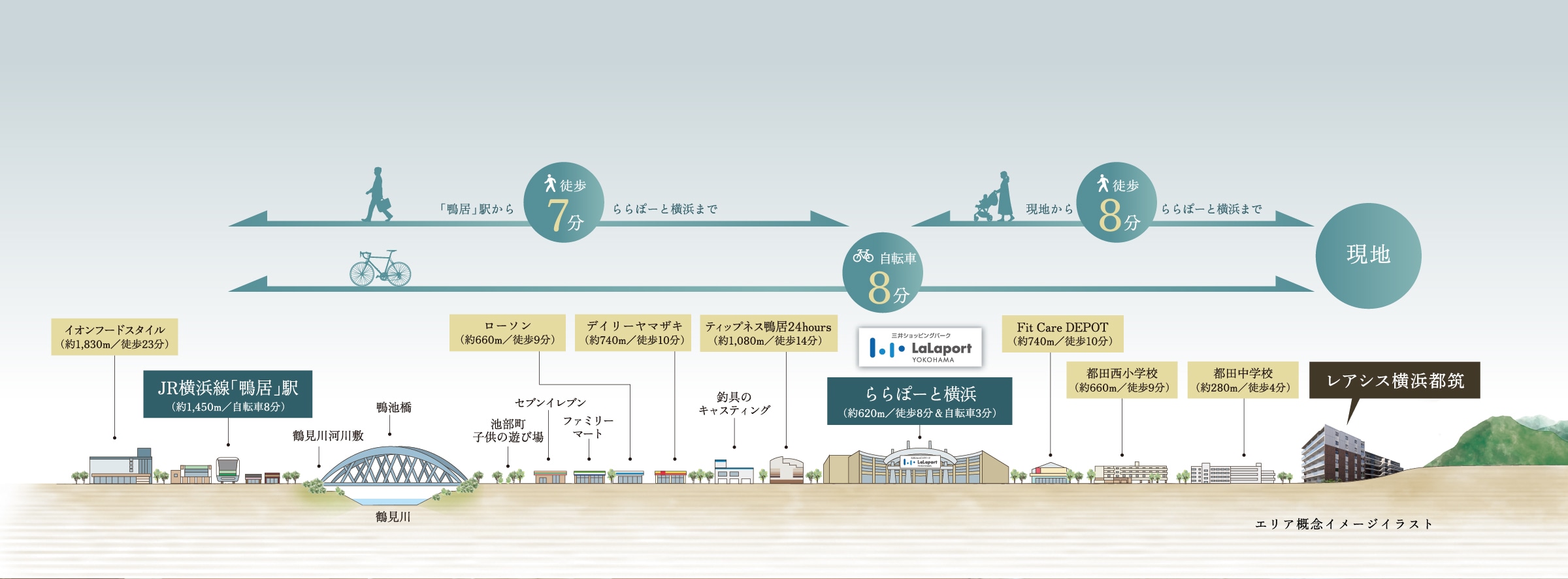 ※掲載のエリア概念図、エリア概念イメージイラストは、立地状況を説明するためのイメージであり、建物位置・高さ・距離・縮尺等は実際とは異なります。