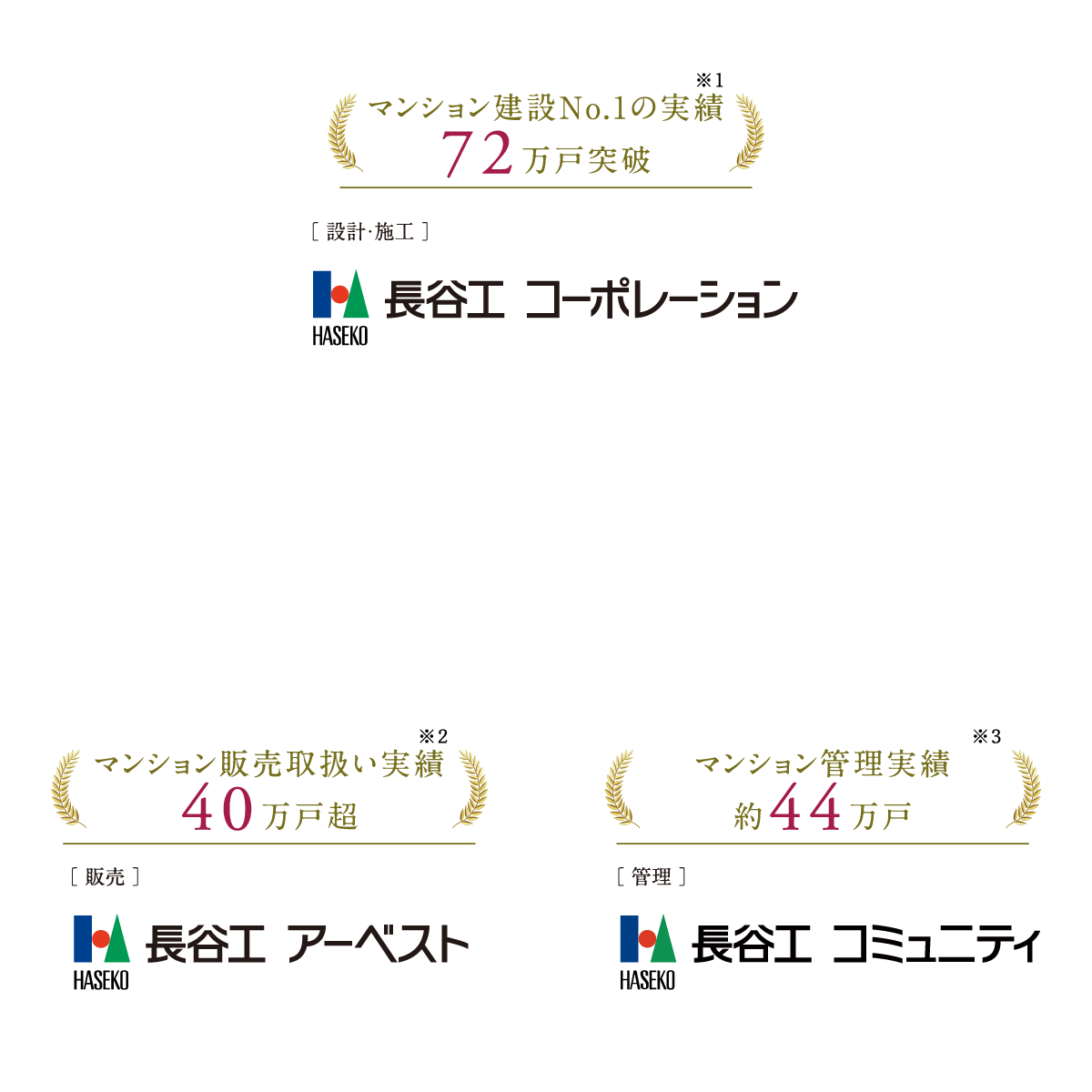 ※1:データに関して(2021年12月末 長谷工総研調べ)対象となっている首都圏・近畿圏の数字は(株)不動産経済研究所から発表されたデータを基にしております。(公社・公団及び平均面積20㎡未満の物件を除く)※2:長谷工アーベストでは、1978年から2020年までの43年間に、関東圏で248,155戸、近畿圏で147,249戸、合計で395,404戸のマンション販売を取り扱っています。※マンション販売取扱いについては、長谷工総合研究所データ(1978年以降)を基にしております。※関東圏は、東京、神奈川、千葉、埼玉、茨城、栃木物件対象。※長谷工アーベストの前身、長谷川工務店マンション部、エイチ・ケイ販売専門会社、長谷工販売、長谷工販売関西による実績も含む。※3:管理会社グループ総数、2022年1月末現在