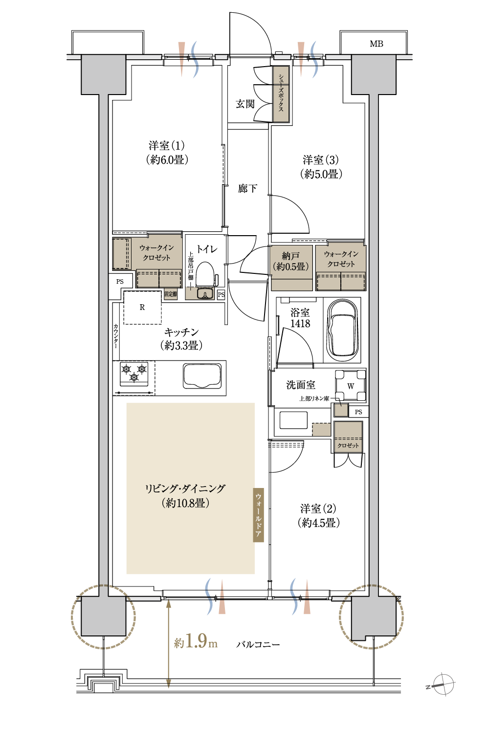 - バルコニー奥行き約1.9m