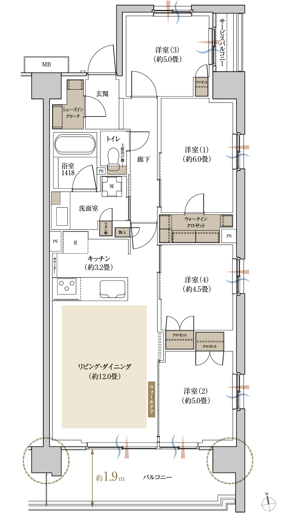 - バルコニー奥行き約1.9m
