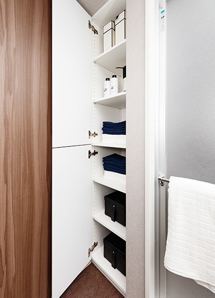 バスタオルや入浴後の着替え、洗面用具、洗剤などをストックしておくのに便利です。