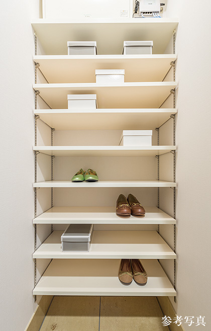 可動棚を備え、ブーツなどさまざまなサイズの履き物を効率よく収納。玄関がすっきりと片づきます。