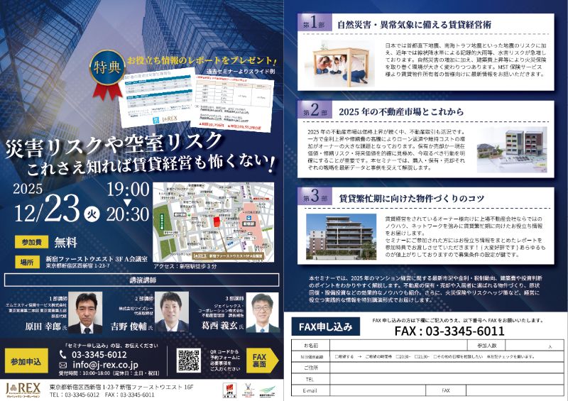 TOP新着情報 2025年12月23日(火)「賃貸経営セミナー」【災害リスクや空室リスク これさえ知れば賃貸経営も怖くない!】を開催!(参加無料)